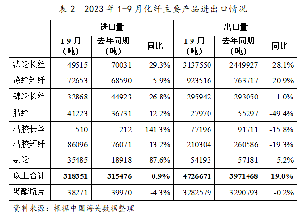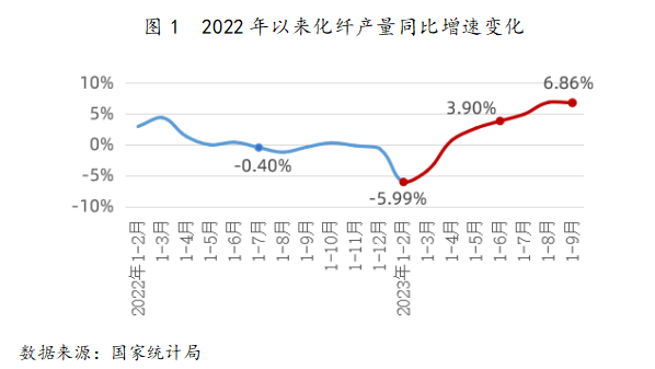 據(jù)國(guó)家統(tǒng)計(jì)局?jǐn)?shù)據(jù),2023年1-9月化纖產(chǎn)量為5230萬(wàn)噸,同比增長(zhǎng)6.86%,較去年同期增速提高7.18個(gè)百分點(diǎn)。化纖產(chǎn)量增速呈現(xiàn)逐步上升趨勢(shì),1-9月增速較1-6月增速提高2.96個(gè)百分點(diǎn)。分省市看,1-9月浙江省化纖產(chǎn)量同比增長(zhǎng)4.7%;江蘇省化纖產(chǎn)量同比增長(zhǎng)19.6%;福建省化纖產(chǎn)量同比減少7.6%。