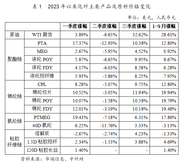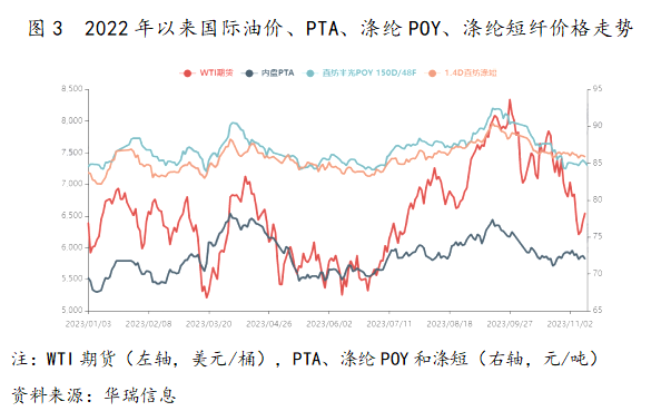 從聚酯產(chǎn)業(yè)鏈價(jià)格走勢(shì)看,滌綸價(jià)格基本跟隨原油價(jià)格走勢(shì),一季度微漲,二季度下跌,三季度回升。前兩季度,原油基本保持在70-80美元/桶震蕩。三季度,受宏觀加息暫緩和沙特減產(chǎn)等影響,原油價(jià)格開(kāi)啟上漲模式,漲幅高達(dá)32.62%,且在9月中下旬超過(guò)90美元/桶;PTA、滌綸價(jià)格跟隨原料上漲,但漲幅有限,僅上漲10%左右。10月以來(lái),原油震蕩下跌,PTA、滌綸都跟隨下跌,目前價(jià)格已跌回二季度末低位價(jià)格。