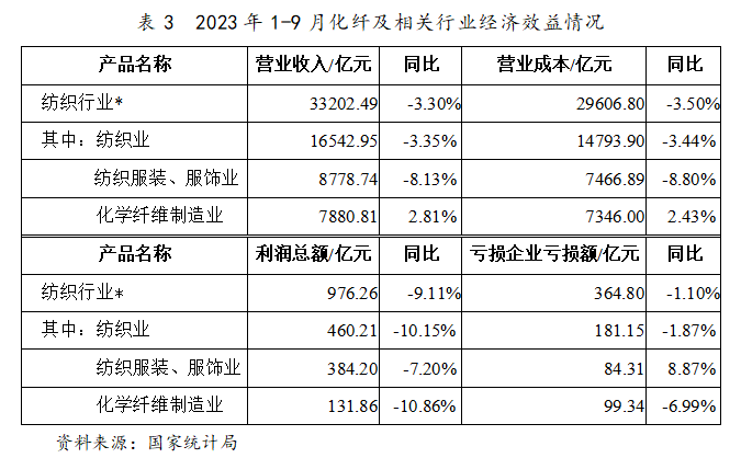 前三季度,化纖行業(yè)經(jīng)濟(jì)效益延續(xù)了2022年的下滑態(tài)勢(shì),但各項(xiàng)效益指標(biāo)呈現(xiàn)逐季向好趨勢(shì),營(yíng)業(yè)收入和利潤(rùn)總額同比降幅逐漸收窄,虧損企業(yè)虧損額增速也呈下降趨勢(shì)。據(jù)國(guó)家統(tǒng)計(jì)局?jǐn)?shù)據(jù),1-9月化纖行業(yè)營(yíng)業(yè)收入同比增加2.81%,自8月起,累計(jì)增速已轉(zhuǎn)正;利潤(rùn)總額同比減少10.86%,降幅較1-6月收窄44.72個(gè)百分點(diǎn);營(yíng)收利潤(rùn)率為1.67%,較1-6月提升0.51個(gè)百分點(diǎn)。
