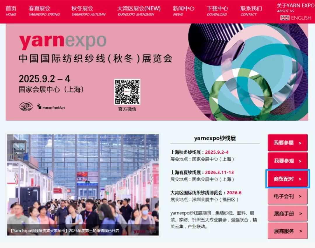 只要您有采購纖維紗線產品意向,希望快速找到心儀的產品,便可通過主辦方【商貿配對】預約服務系統進行申請。
