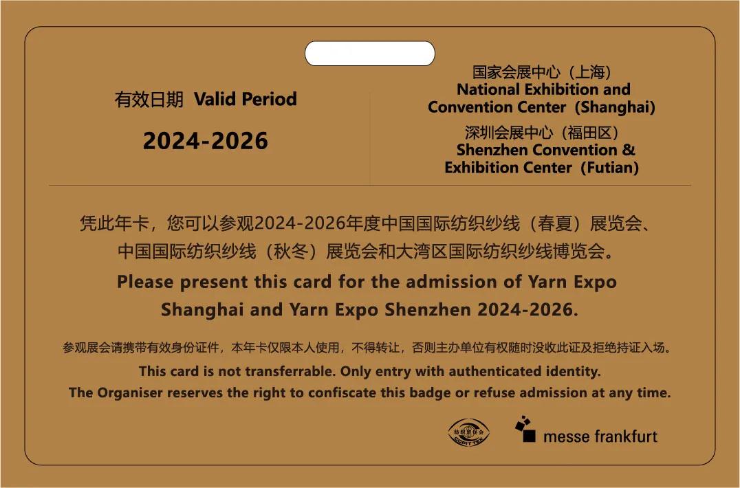 Yarn Expo紗線展貴賓買家年卡是Yarn Expo紗線展組委會為專業觀眾提供的特別服務。貴賓買家年卡三年為一個有效周期,本周期即在2024至2026年三年內,持卡觀眾可憑此卡參觀2024-2026年度中國國際紡織紗線(春夏)展覽會、大灣區國際紡織紗線博覽會、中國國際紡織紗線(秋冬)展覽會,并享受主辦方為您提供的系列專屬服務。